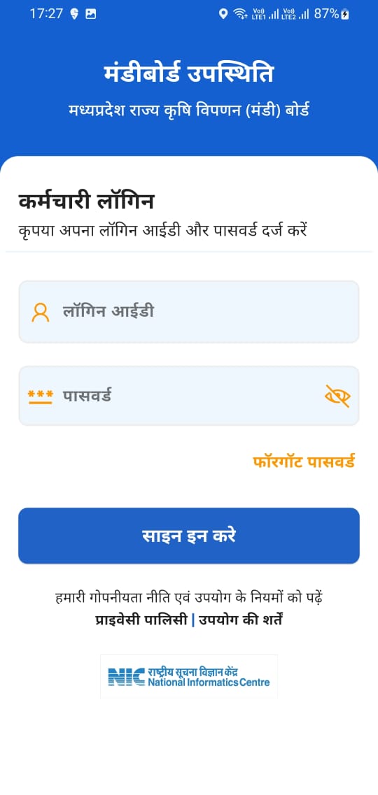 मंडीबोर्ड उपस्थति एंड्रॉइड ऐप एमपीएससी एनआईसी (भोपाल) द्वारा विकसित किया गया है। हमारी मुख्य विशेषता जियो टैगिंग और आई ब्लिंक सुविधा के साथ वास्तविक समय में उपस्थिति सुविधा प्रदान करना है |